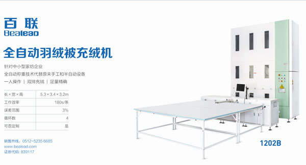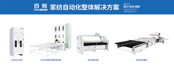 今年以來,百聯(lián)整合家紡自動(dòng)化產(chǎn)品資源,針對(duì)羽絨被、枕頭、靠墊等家紡產(chǎn)品的應(yīng)用需求,推出了可個(gè)性化定制的家紡充填類自動(dòng)化整體解決方案。這些產(chǎn)品主要涉及全自動(dòng)上料機(jī)、羽絨被充絨機(jī)、被子折疊機(jī)、打包機(jī)等,形成了完整的家紡自動(dòng)化流水線,幫助客戶企業(yè)提高生產(chǎn)效率、降低人力成本、提高產(chǎn)品質(zhì)量,為實(shí)現(xiàn)“智能工廠”及“智能生產(chǎn)”提供了有力的保障。