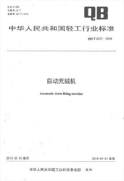 自2018年7月1日起,由百聯(lián)牽頭主起草的編號為QB/T5225-2018 號的“自動(dòng)充絨機(jī)”行業(yè)推薦性標(biāo)準(zhǔn)正式實(shí)施了。該標(biāo)準(zhǔn)規(guī)定了自動(dòng)充絨機(jī)的術(shù)語和定義、產(chǎn)品分類、要求、試驗(yàn)方法、檢驗(yàn)規(guī)則、標(biāo)志、包裝、運(yùn)輸和貯存,適用于自動(dòng)充絨機(jī),其他充填物的類似設(shè)備可參照執(zhí)行。