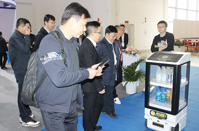 在聯(lián)領(lǐng)智能的展位上,參觀者好奇地圍聚在一個內(nèi)裝食品的小柜子前。小柜子能自動避開障礙物,自由穿梭在來往的參觀者之間,為其提供自助購物服務(wù)。