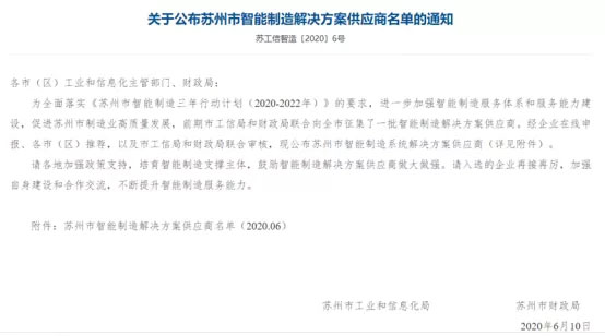 此次征集,是在蘇州市為全面落實《蘇州市智能制造三年行動計劃(2020-2022年)》的要求,進一步加強智能制造服務體系和服務能力建設,促進蘇州市制造業(yè)高質(zhì)量發(fā)展的背景下開展,是按照立足蘇州、基礎良好、自主可控、業(yè)績突出原則,征集一批專業(yè)服務能力強、能夠有效支撐服務蘇州制造業(yè)轉型升級發(fā)展的智能制造解決方案供應商。