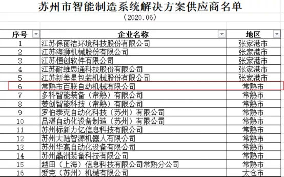 近日,蘇州市工信局公布了《蘇州市智能制造解決方案供應商》的名單,全市共有141家企業(yè)入選,其中常熟市10家。我司(常熟市百聯(lián)自動機械有限公司)入選在列!
